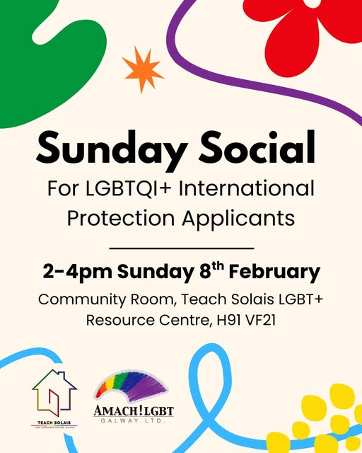 Sunday 8th February 2026 from 2pm to 4pm Community Room, Floor 1 at Teach Solais LGBT+ Resource Centre, Galway City Amach LGBT Galway will be hosting a Sunday social gathering for LGBTQI+ international protection applicants on Sunday the 8th February. Join us in the Community Room, Floor 1 at Teach Solais LGBT+ Resource Centre - email info@amachlgbt.com for any questions or concerns.