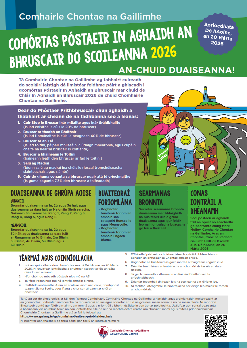 Spriocdháta: Dé hAoine 20 Márta 2026 roimh 4i.n. Tá Comórtas Póstaer Frith-Bhruscair Scoileanna Chomhairle Chontae na Gaillimhe ar ais do 2026! Tá Comhairle Chontae na Gaillimhe ag tabhairt cuireadh do dhaltaí laistigh dá limistéar feidhme páirt a ghlacadh i gcomórtas Póstaer Frith-Bhruscair mar chuid de Chlár Frith-Bhruscair Chomhairle Chontae na Gaillimhe 2026. Seol póstaeir ar aghaidh tríd an bpost nó seachadta go pearsanta chuig Mark Molloy, Comhairle Chontae na Gaillimhe, Áras an Chontae, Cnoc na Radharc, Gaillimh H91 H6KX.