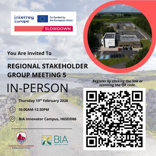 Thursday 19th February from 10:00am – 12:30pm - BIA Innovator Campus, H65 DD86 Register by: 16 February Interreg Europe Slowdown Meeting BIA Innovator Campus, in partnership with Galway County Council, invites local tourism and hospitality businesses, community organisations, food and walking initiatives, and those involved in sustainable tourism and rural development to attend Regional Stakeholder Group Meeting 5, taking place in person at BIA Innovator Campus on Thursday, 19 February at 10:00am. Register here or via the QR code by 16 February. Can’t attend in person? An online participation option will be available for those who indicate this during registration.