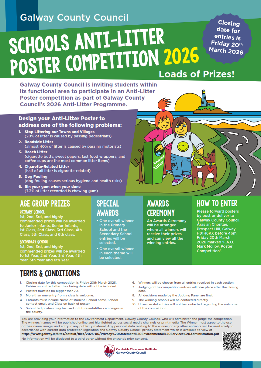 Closing date: Friday 20th March 2026 at 4pm Galway County Council Schools Anti-Litter Poster Competition is back for 2026! Galway County Council is inviting students within its functional area to participate in an Anti-Litter Poster competition as part of Galway County Council's 2026 Anti-Litter Programme. Please forward posters by post or deliver to: Galway County Council, Áras an Chontae, Prospect Hill, Galway H91 H6KX marked ‘F.A.O. Mark Molloy, Poster Competition’.