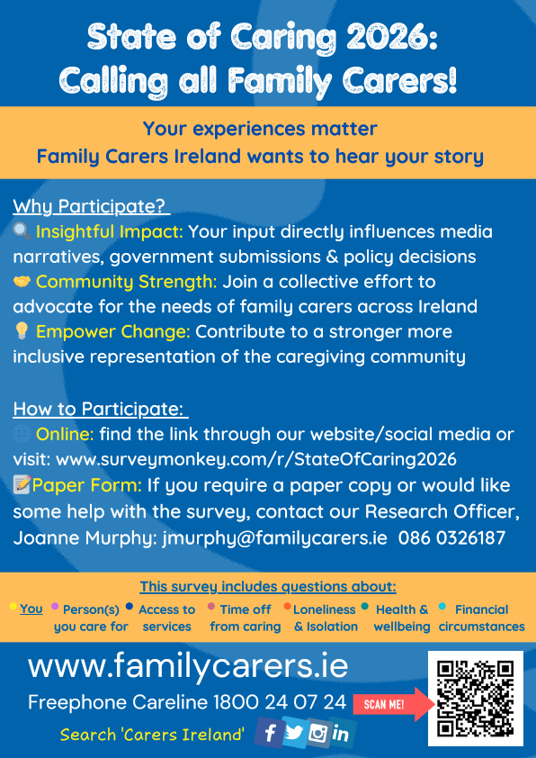 Closing date: Wednesday 4th March 2026 State of Caring 2026: Calling all Family Carers! Family Carers Ireland wants to hear your story. The State of Caring 2026 survey is now open and takes approximately 30 minutes to complete and is primarily online. To ensure accessibility, we also provide paper copies of the survey and telephone support for carers who may need assistance completing it. Carers who would like a paper copy or support can contact me directly: Joanne Murphy, Research Officer jmurphy@familycarers.ie 086 032 6187 Survey link: https://www.surveymonkey.com/r/StateOfCaring2026