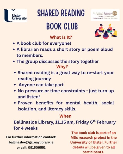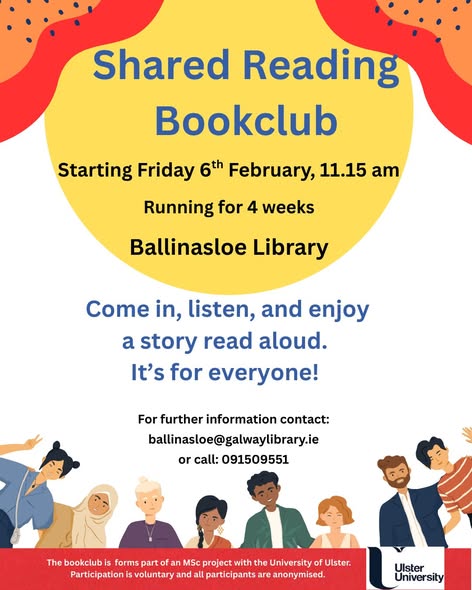 Starting Friday 6th February 2026 at 11:15am and running for 4 weeks. Ballinasloe Library Looking for a relaxing way to enjoy stories? Join us for our Shared Reading Bookclub! Come in, listen, and enjoy a story read aloud - no pressure, no prep, just a welcoming space for everyone. Perfect for anyone who loves stories or wants to reconnect with reading. Ballinasloe Library: Email: ballinasloe@galwaylibrary.ie Phone: 091 509 551