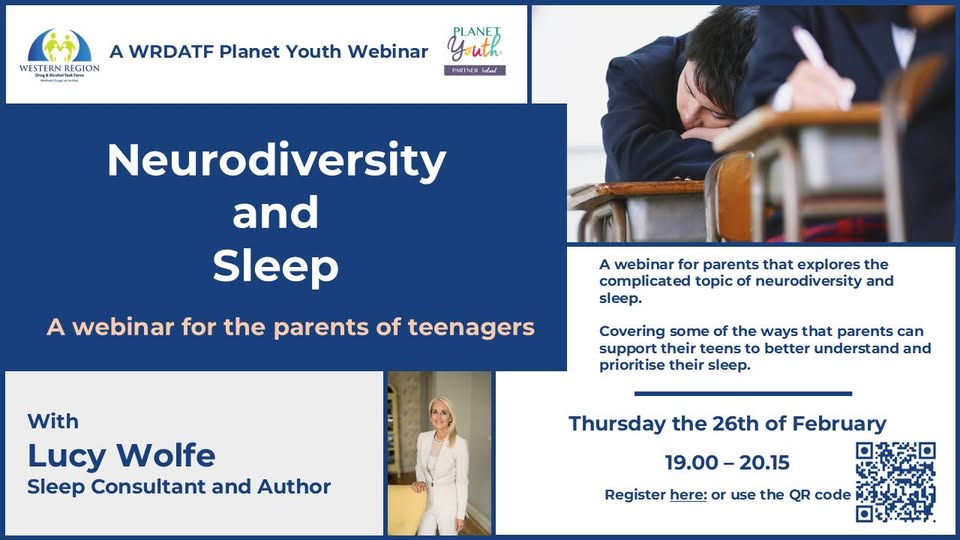 Thursday 26th February at 7pm - Online Lucy Wolfe, Sleep Consultant and Author will explore the complicated topic of neurodiversity and sleep. This webinar will cover some of the ways that parents can support their teens to better understand and prioritise their sleep. Parents can register at: https://www.wrdatf.ie/parent-hub/events.php