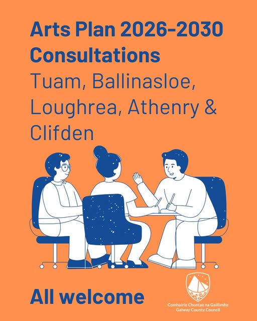 Closing date: Saturday 28 February 2026 Galway County Council is preparing a new Arts Plan 2026-2030 which will set out the direction, priorities and goals that will guide our work into the next decade. A public information and consultation meeting will take place in each of our five Municipal Districts. Galway County Council is very interested to hear from you, whether you are involved in the arts or not, to assess what value you place on the arts; how, if at all, you engage with the arts or, if you feel there are ways to generate more opportunity for people to engage creatively in arts activity. All are welcome to attend the next Arts Plan consultations in Ballinasloe, Loughrea, Athenry or Clifden. Ballinasloe: Wednesday 18 February 7:00pm - 8:30pm - Shearwater Hotel, Marina Point, Ballinasloe, Co Galway H53 F5P9 The meeting room is wheelchair accessible. Click here to register.
