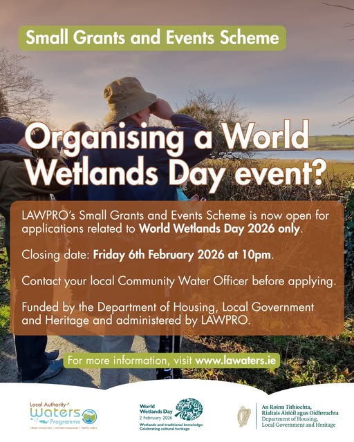 Closing date: Friday 6th February 2026 at 10pm The Small Grants and Events Scheme is for community groups who wish to apply for funding for small scale initiatives and events outside of LAWPRO’s targeted open calls. It covers events such as World Wetlands Day, Biodiversity Week, Science Week, etc. It may also be used for small awareness raising initiatives such as surveys and plans, citizen science, hosting a meeting, workshops, litter pick, publications, biodiversity signage, or other such small scale initiatives. Applications must have a water quality or water awareness focus. For more information about applying, visit the online application portal. Applications should be less than €500. You must contact your local Community Water Officer before making an application. Full guidelines are available here:: LAWPRO Small Grants & Events Scheme Guidelines 2026
