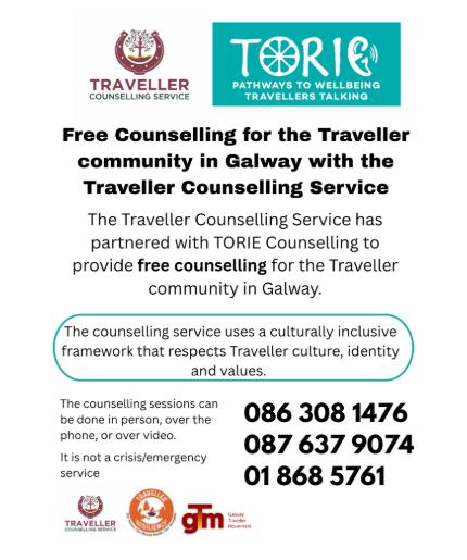Are you part of the Traveller Community and need to talk to someone? The Traveller Counselling Service, partnering with Toire, are offering a free counselling service to the Traveller community in Galway. For more information call 086 308 1476 or 087 637 9074 or 018 685 761