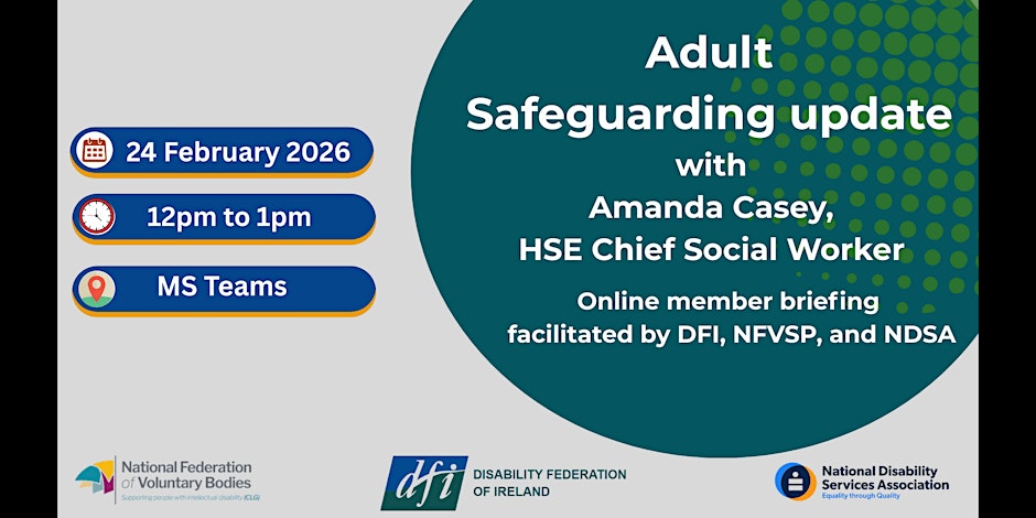 Thursday 24th February 12pm - 1pm - Online Join us for an online webinar with Amanda Casey, Chief Social Worker, HSE, who will outline the work she has been engaged in since taking up post in August 2024 and current developments in adult safeguarding policy, practice and reform in the HSE. The Disability Federation of Ireland, DFI, the National Federation of Voluntary Service Providers supporting people with Intellectual Disabilities, NFVSP and the National Disability Services Association, NDSA are jointly hosting this briefing session for their member organisations. Please complete the full registration form including any key questions you wish to raise as part of the webinar. Register HERE