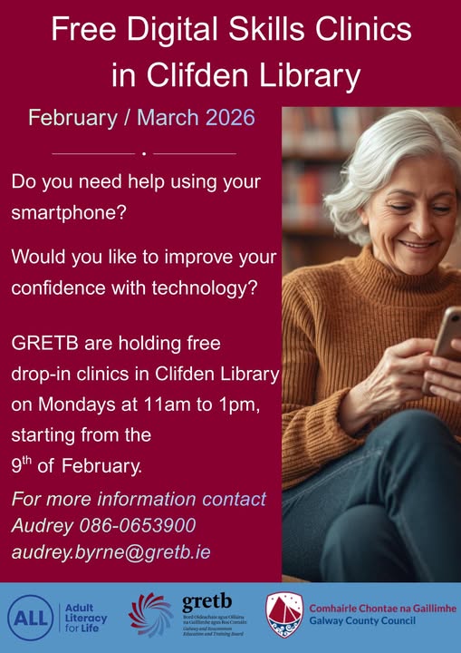 An Clochán: Déardaoin 26 Feabhra 6:00pm – 7:30pm -Clifden Station House, Conamara, H71 AK52. Tá an seomra cruinniú inrochtana ag cathaoireacha rothaí. Cliceáil anseo chun clárú.
