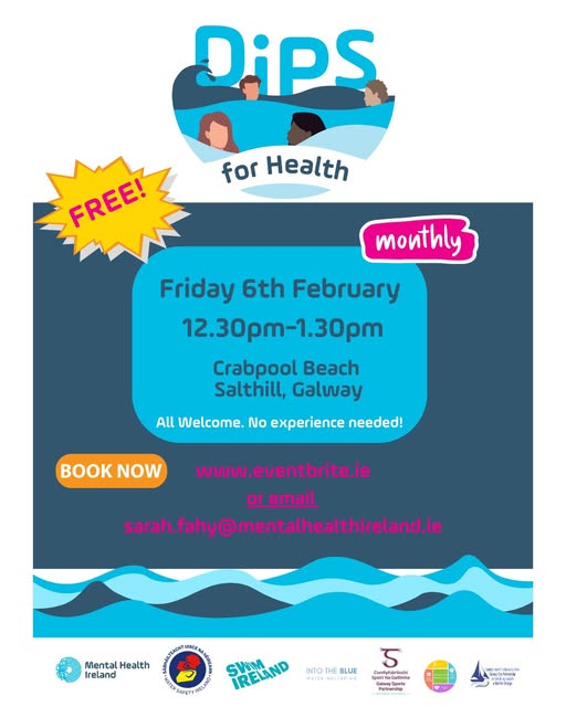 Friday 6th February 2026 12.30pm - 1.30pm Crabpool Beach, Salthill, Galway Find Your Calm by the Sea with Dips for Health. There’s something truly uplifting about fresh sea air, the sound of waves, and the simple act of showing up — for yourself and others. That’s exactly what our Dips for Health gatherings are all about. It’s not about how far you swim — it’s about connection, nature and wellbeing. Whether you dip a toe or go right in, everyone is welcome. Meet us at the Yellow Shelter on Salthill Prom in Galway (near Ladies Beach & Crabpool Beach) for a relaxed walk, chat about the benefits of being in blue spaces, and time by the water — with or without taking the plunge. Lifeguards are on site, and there’s no pressure to go in at all. Free and open to everyone 18+ Sign up via Eventbrite: https://www.eventbrite.ie/.../dips-for-health-tickets... or email: sarah.fahy@mentalhealthireland.ie