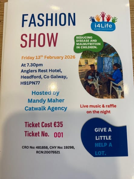 Friday 13th February 2026 at 7:30 pm - Anglers Rest Hotel, Headford, Co. Galway H91 PN77 Join this spectacular FASHION SHOW FUNDRAISER in aid of i4Life. Every ticket sold goes directly towards supporting the Linda Community in Lusaka, Zambia. Hosted by: The fabulous Mandy Maher Catwalk Modelling Agency Features: Live music & a raffle on the night! Ticket Cost: Only €35 To secure your spot for this must-attend event email us directly at info@i4life.ie