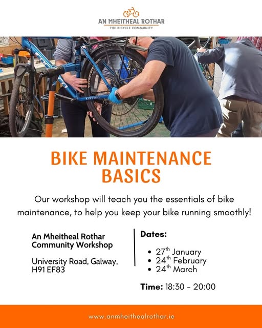 Next dates coming up: Tuesday 24th February and Tuesday 24th March 2026 6.30pm - 8pm An Mheitheal Rothar Community Bike Workshop, Block R, University Road, Galway H91EF83 Bike Maintenance Basics An Mheitheal Rothar’s Workshop will teach you the essentials of bike maintenance, to help you keep your bike running smoothly! It’s on at 6pm on Tuesday 24th and costs just €10. Bring your own bike! Sign up here: https://www.anmheithealrothar.ie/bikemaintenancebasics