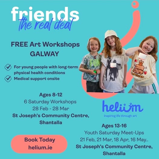 Starting 21st February 2026 Bookings are now open for Helium's FREE workshops in GALWAY for children and young people with long-term physical health conditions. BOOK TODAY at helium.ie Youth Meet-Up's: St Joseph's Community Centre, Shantalla Ages: 13-16 years Workshop Dates: 21 February, 21 March, 18 April, 16 May.