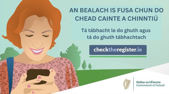 An bhfuil tú 16 nó 17 mbliana d’aois? Is féidir leat clárú roimh ré anois chun vótáil sna toghcháin nó na reifrinn atá le teacht agus cuirfear d’ainm leis an gclárlann go huathoibríoch ar do lá breithe nuair a bheidh tú18 mbliana d’aois. Le haghaidh tuilleadh eolais, tabhair cuairt ar: www.checktheregister.ie