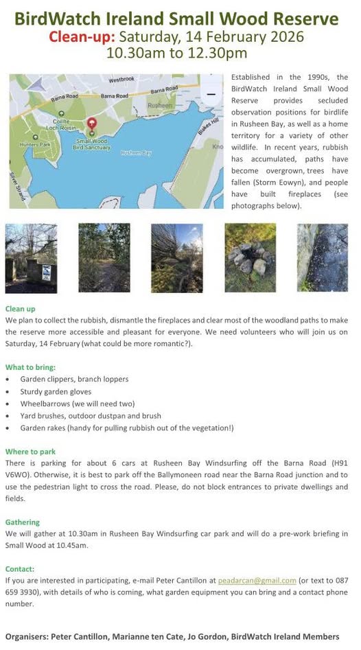 Saturday 14th February, 10.30am - 12.30pm - Small Wood Reserve, Rusheen Bay, Galway City Show a bit of love for nature this Valentine's Day! Join BirdWatch Ireland's Galway Branch and help out at their Small Wood Reserve near Rusheen Bay from 10.30am - 12.30pm. All help welcome!