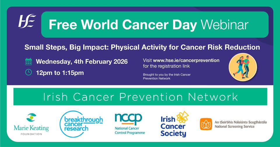 Wednesday 4th February 2026, from 12pm to 1.15pm - Online The Irish Cancer Prevention Network are holding a webinar on Wednesday the 4th of February 2026, World Cancer Day, from 12pm to 1.15pm with the theme of Small Steps, Big Impact: Physical Activity for Cancer Risk Reduction. The webinar content will be delivered by subject matter experts and recorded. Registrants can watch the webinar live or receive a link to watch back at a time convenient for them. Click HERE to register.