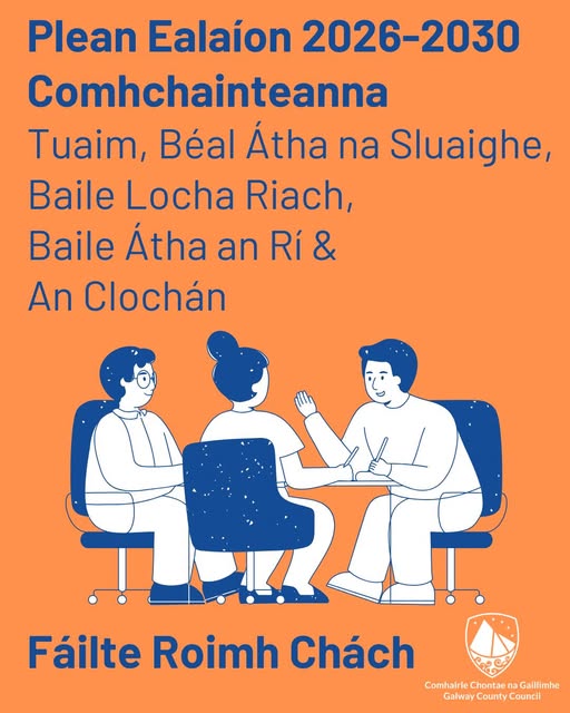 Dáta deiridh: Dé Sathairn 28 Feabhra 2026 Tá Plean Ealaíon nua 2026-2030 á ullmhú ag Comhairle Chontae na Gaillimhe ina leagfar amach an treo, na tosaíochtaí agus na spriocanna a threoróidh ár gcuid oibre isteach sa chéad deich mbliana eile. Tionólfar cruinniú faisnéise agus comhairliúcháin don phobal i ngach ceann dár gcúig Cheantar Bhardasacha. Tá suim mhór ag Comhairle Chontae na Gaillimhe cloisteáil uait, cibé acu an bhfuil baint agat leis na healaíona nó nach bhfuil, le fáil amach cén luach a chuireann tú ar na healaíona; conas, más ann dó ar chor ar bith, a mbíonn baint agat leis na healaíona nó, má cheapann tú go bhfuil bealaí ann chun níos mó deiseanna a thabhairt do dhaoine páirt a ghlacadh go cruthaitheach i ngníomhaíocht ealaíon. Fáilte roimh chách freastal ar na chéad chomhairliúcháin eile faoin bPlean Ealaíon i mBéal Átha na Sluaighe, i mBaile Locha Riach, i mBaile Átha an Rí, ar An gClochán.